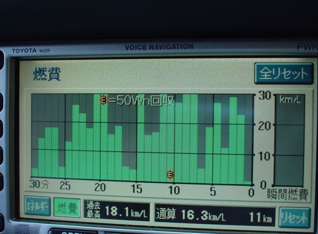 区間燃費:16.3km/L、距離11km、所要時間30分