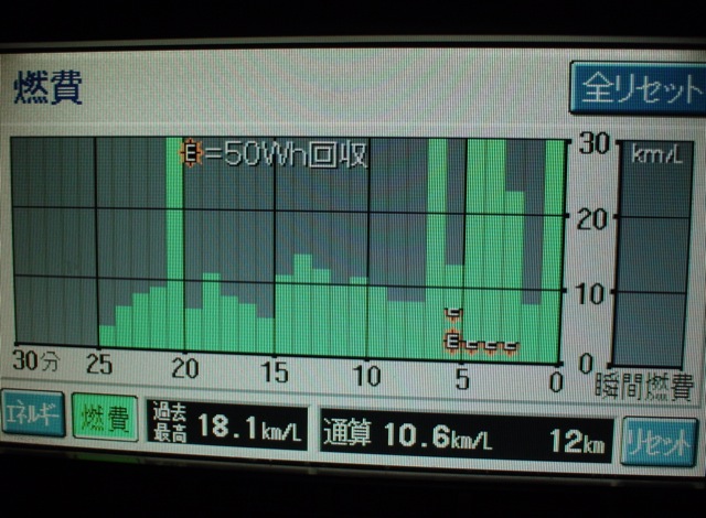 区間燃費:10.6km/L 距離12km 所要時間25分と出ました。