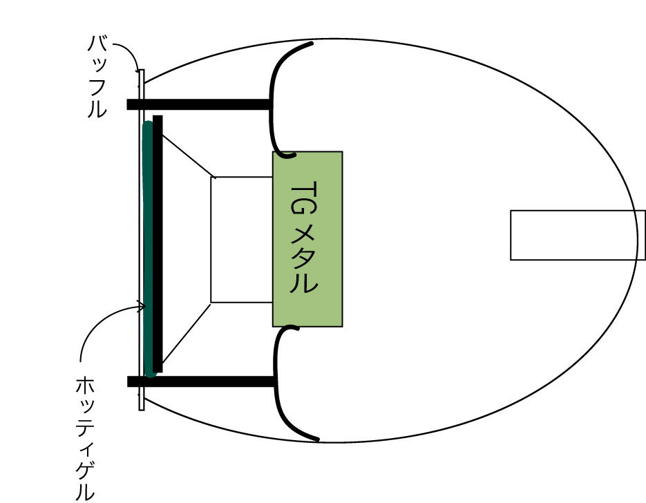 板バネで、中空に固定したTGメタル(鉛の塊)にユニットの背面をあてがい、バッフルとユニットのフレームにはゲルで絶縁して、ネジで挟み込んでいます。